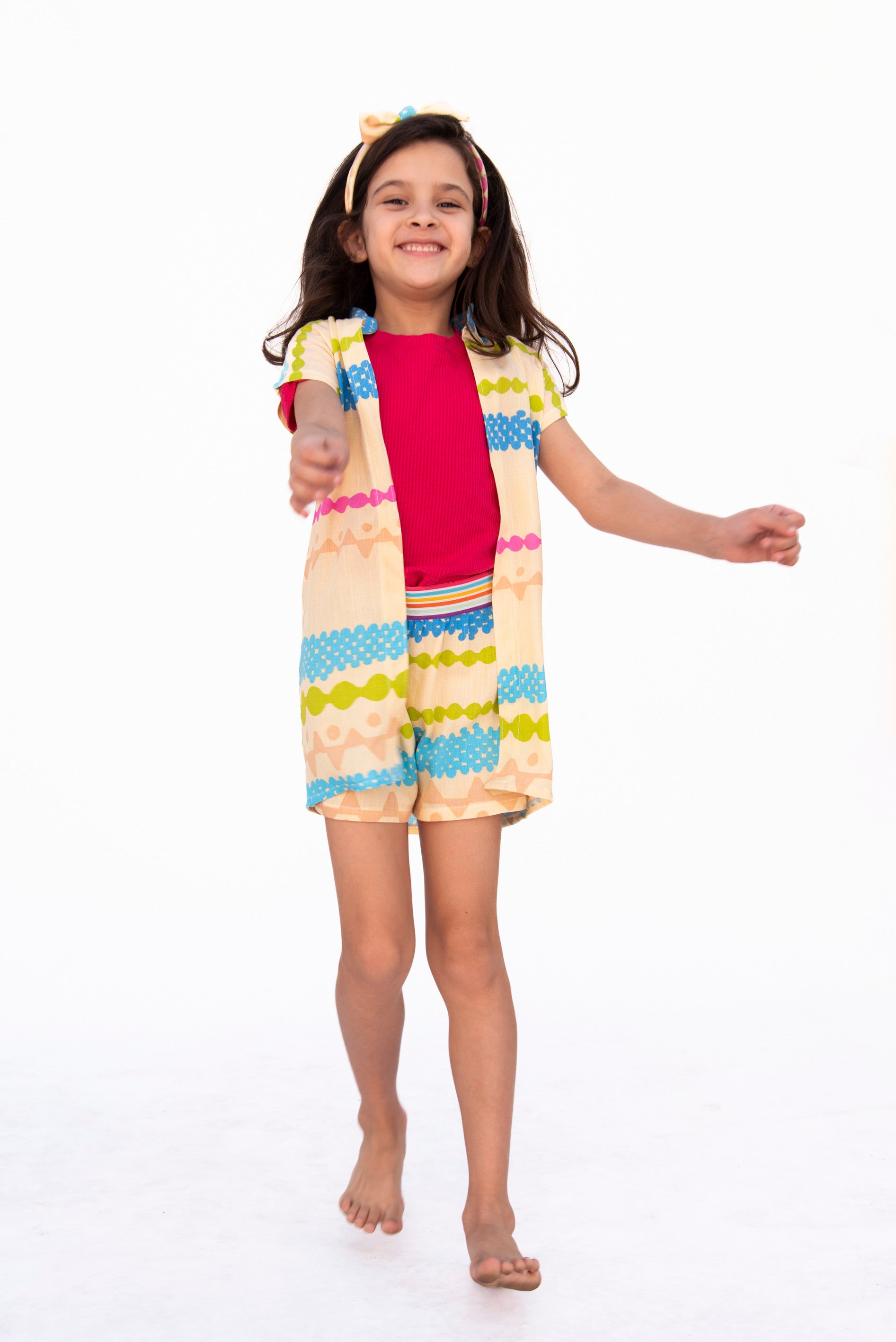 Disponível para meninas de 4 a 12 anos, o conjunto é composto por uma bata estilo kimono, aberta e bem soltinha e também acompanha um short soltinho com elástico colorido na cintura, fazendo um composê alegre e divertido.