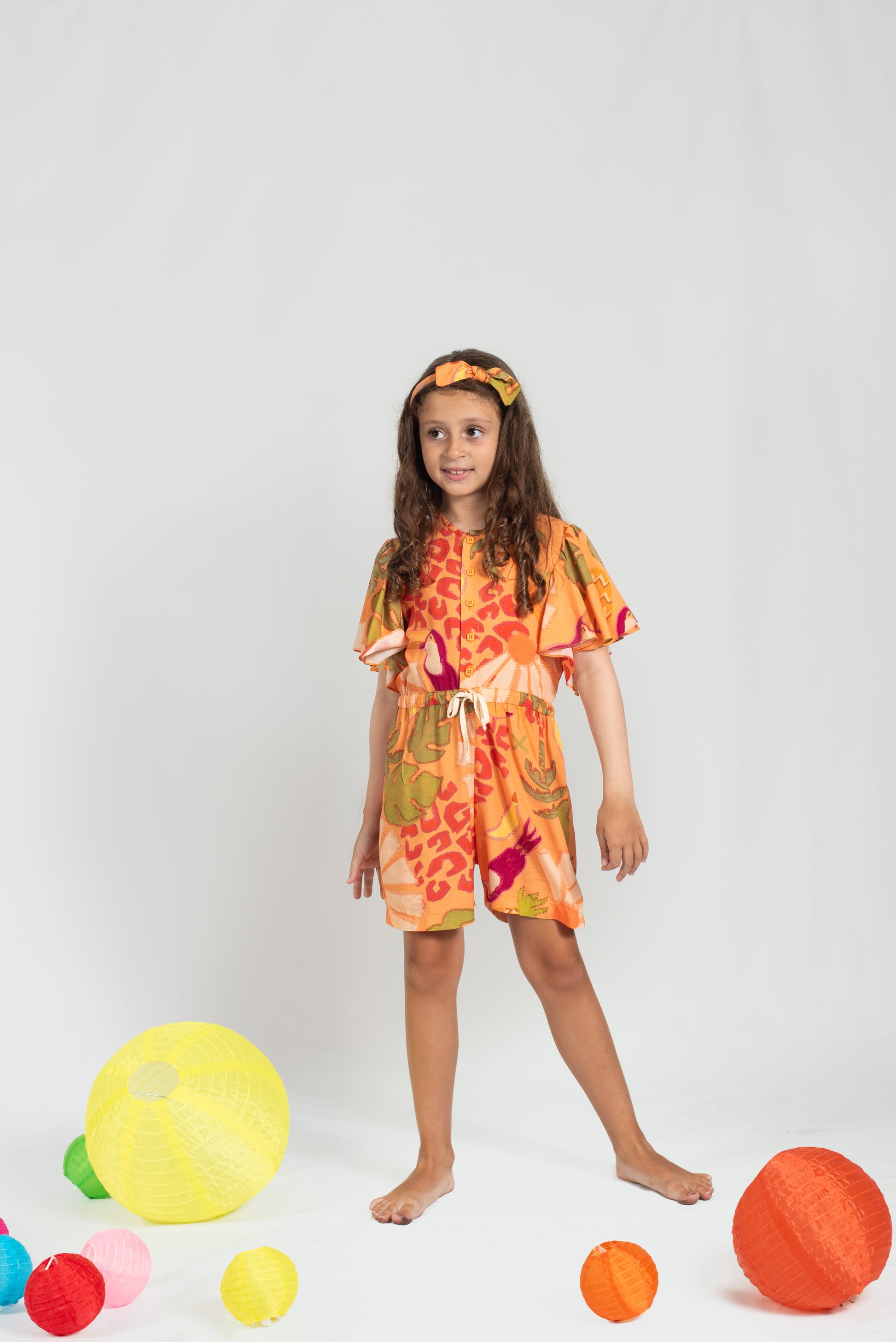Disponível para meninas de 4 a 12 anos, o macaquinho possui mangas com babado soltinho, abotoamento na parte da frente e cadarço com amarração regulável que permite o ajuste na cintura.