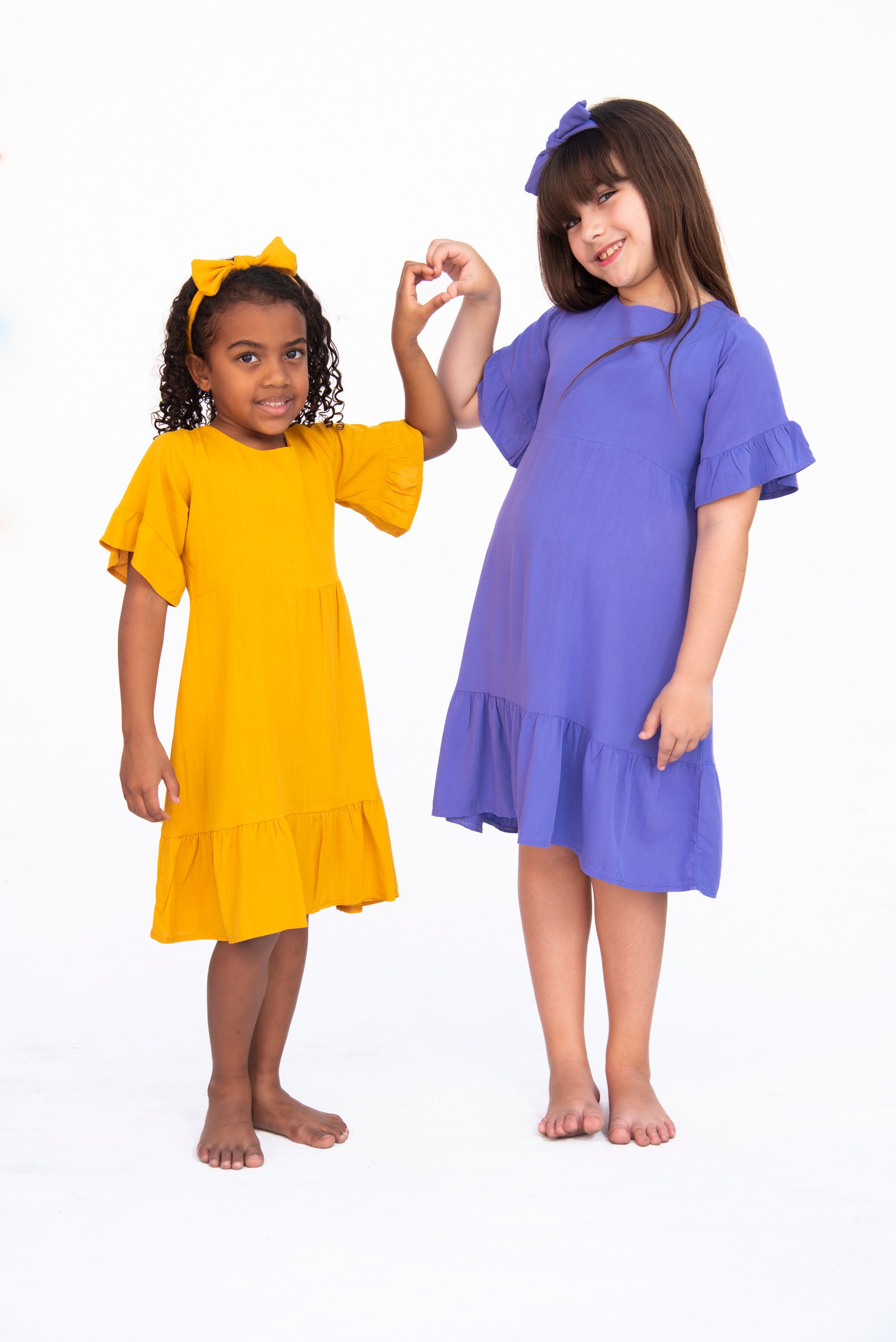 Disponível para meninas de 2 a 12 anos, o vestido está disponível nas cores amarelo e roxo. Confeccionado com tecido leve e muito confortável, o conjunto possui um decote com laço nas costas, babado nas mangas e na bainha. Suas cores vibrantes garantem a alegria de se vestir de forma divertida e colorida como a infância deve ser.