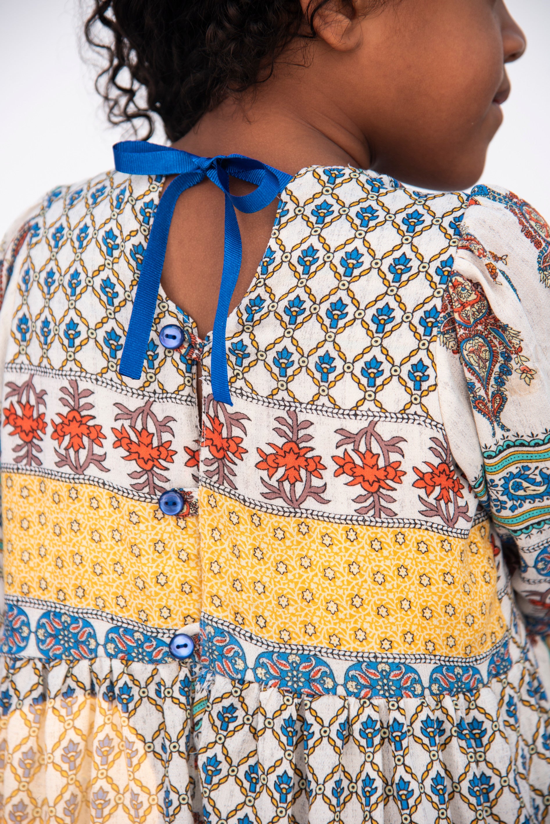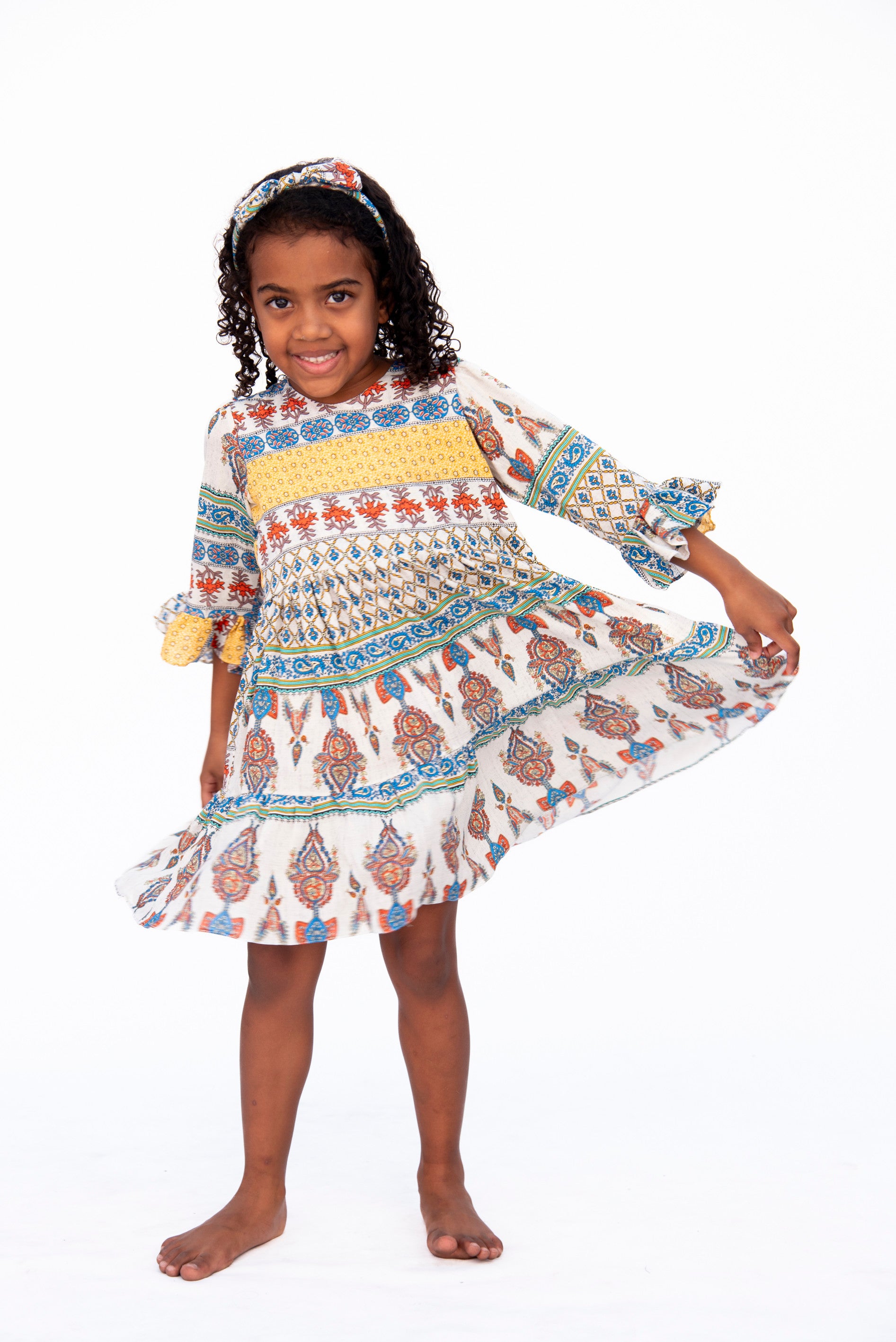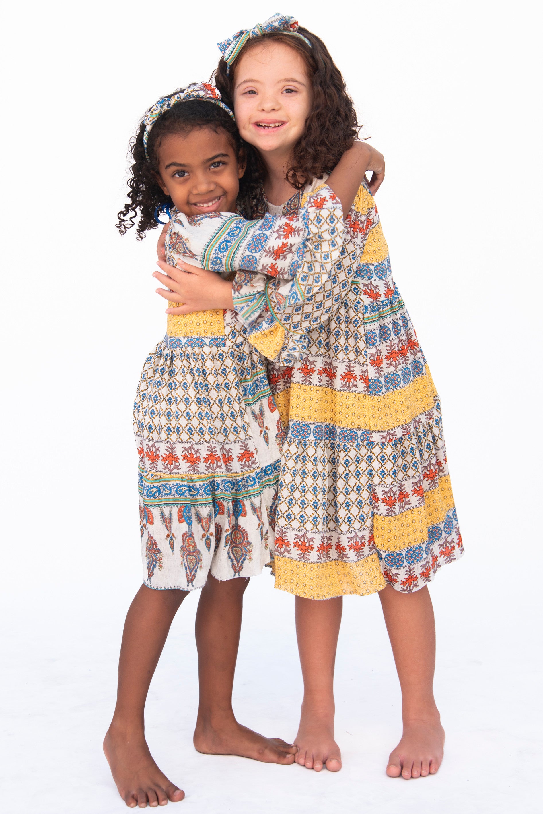 Disponível para meninas de 4 a 12 anos, o vestido é bem soltinho, possui uma abertura com botão e laço nas costas e babado nas mangas. A parte de baixo faz um estilo de uma saia bem rodada proporcionando uma sensação de conforto e leveza.
